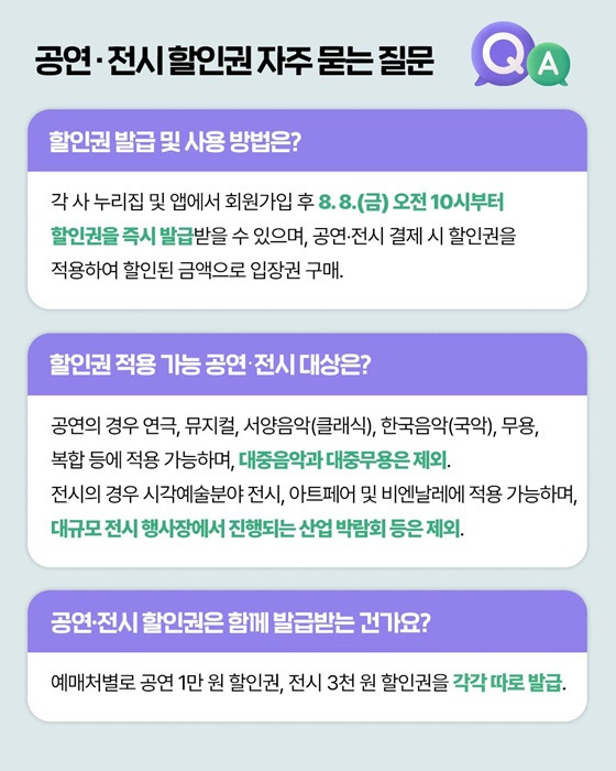 A. 각 사 누리집 및 앱에서 회원가입 후 8.8.(금) 오전 10시부터 할인권을 즉시 발급받을 수 있으며 공연/전시 결제 시 할인권을 적용하여 할인된 금액으로 입장권 구매.