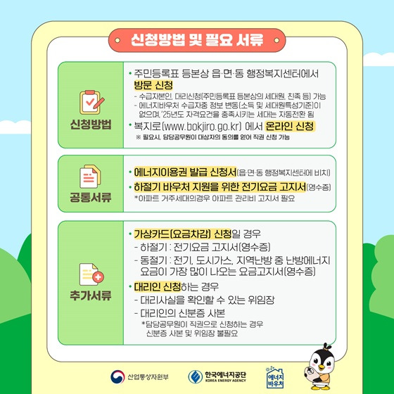 - 신청 및 사용 : 읍.면.동 행복복지센터에서 에너지바우처를 신청 후 은행 등에서 실물카드(국민행복카드)를 발급받아 필요 에너지 결제