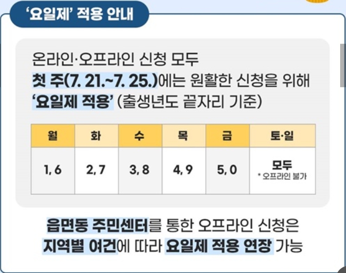 ● 온라인/오프라인 신청 모두 첫 주(7월21 ~ 7월 25일)에는 원활한 신청을 위해 '요일제 적용' (출생년도 끝자리 기준)