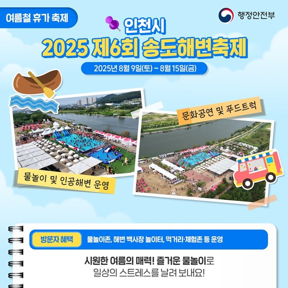 제 6회 송도 해변 축제에서는 도심 가까운 해변에서 물놀이존, 해변 백사장 놀이터, 먹거리/체험존 등 운영을 하고 있으며 물놀이 및 인공해변도 운영하고 있고 문화공연 및 푸드트럭도 있으니 시원한 여름의 매력을 느끼며 즐거운 물놀이로 일상의 스트레스를 날려 보내봅시다.