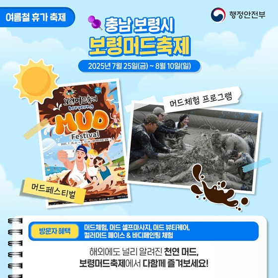 | 보령머드축제 | 7.25–8.10 | 충남 보령 대천해수욕장 | 머드셀프마사지, 뷰티케어, 컬러머드 페인팅 | 국내외 인기, 뷰티+치유 요소 포함 |