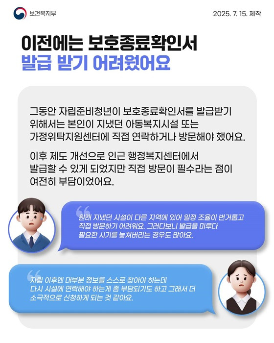그동안 자립준비청년이 보호종료확인서를 발급받기 위해서는 본인이 지냈던 아동복지시설 또는 가정위탁지원센터에 직접 연락하거나 방문해야 가능했습니다. 이후 제도 개선으로 인근 행복복지센터에서 발급할 수 있게 되었지만 직접 방문이 필수라는 점이 여전히 부담이었어요.