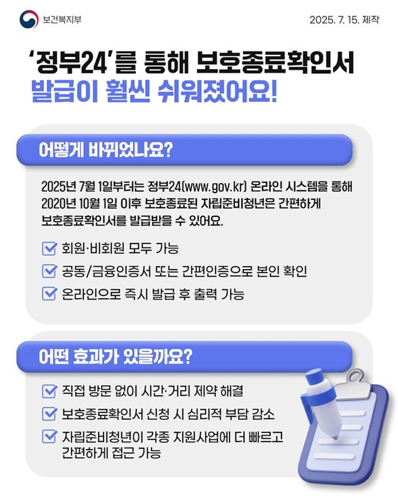2025년 7월 1일부터 '정부24'에서 온라인 시스템을 통해 2020년 10월 1일 이후 보호종료된 자립준비청년은 간편하게 보호종료확인서를 발급받을 수 있어요.