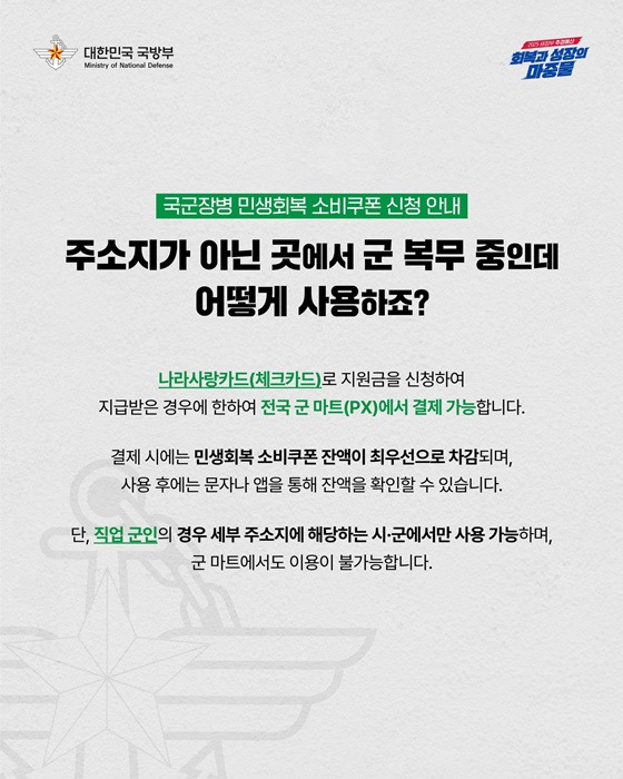 ● 직업군인의 경우 세부 주소지에 해당하는 시/군에서만 사용 가능하며 군 마트에서도 이용이 불가능합니다.