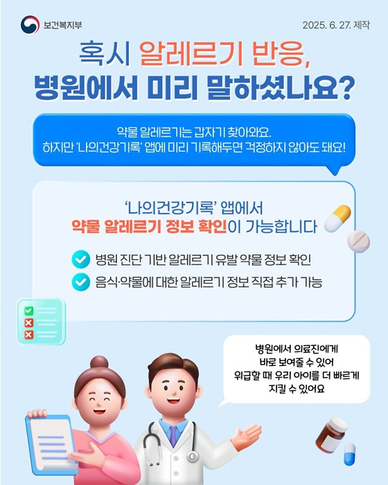 ㅁ '나의건강기록' 앱에서 약물 알레르기 정보 확인이 가능합니다.